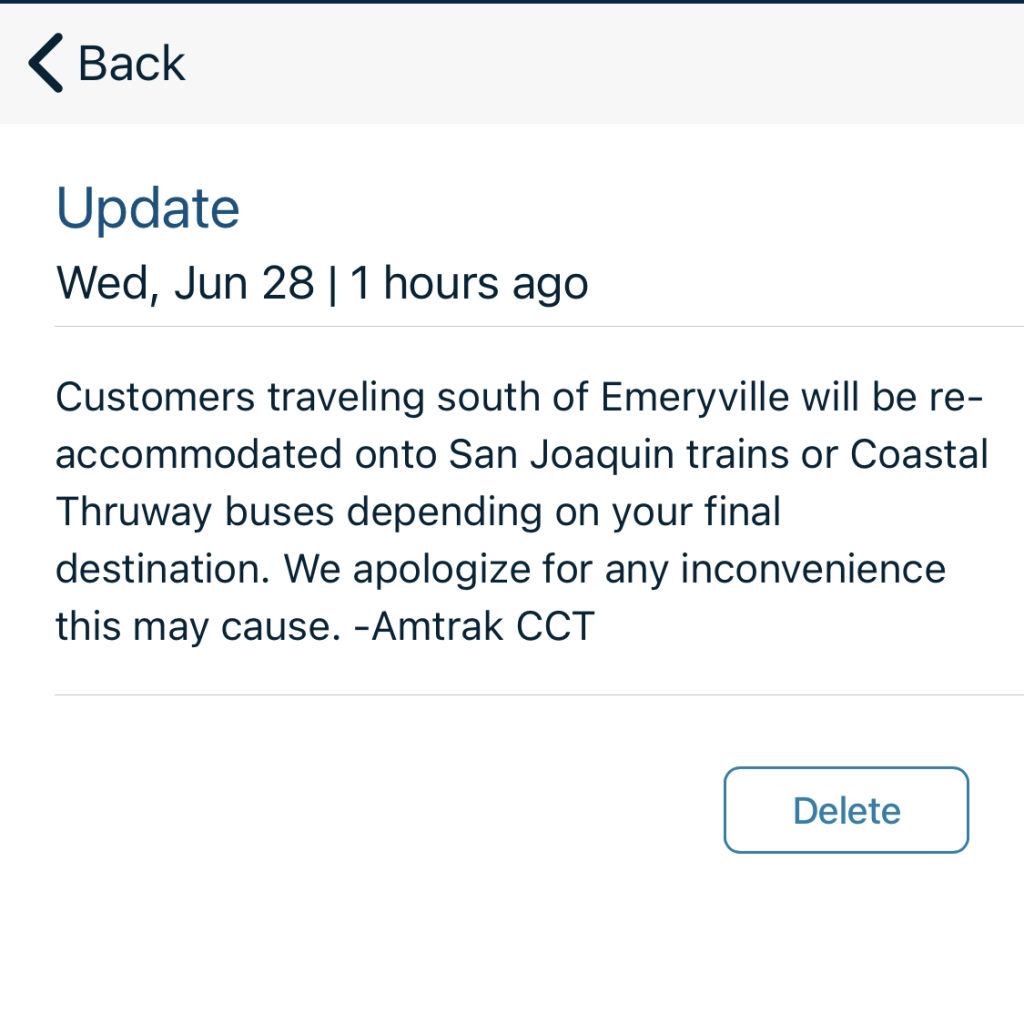 Some folks had other transportation arranged because Emeryville was their final destination. The rest of us went straight into the station to arrange our promised follow-on transportation. Get this, there was nobody at the counter and we were all attempting to use a self-service kiosk that didn’t understand the situation. Chaos. The worst. Hated it.