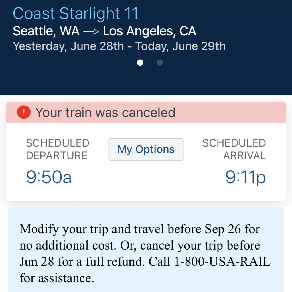 Day 1 was going great until I received a notification there was a cancelation. Apparently it was due to a disruption on the track which we would later find out was the wreck. This notification came through on the app and via text message but nobody knew what to do (not even the onboard staff). In an attempt to get ahead of the game and get some money back, I failed. A combination of unclear information, customer service problems, and heading into the mountains (with no cell phone service) led to this failure. A great way to stress out on [what was supposed to be] a relaxing journey.